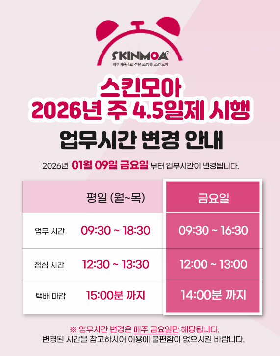 ¾È³çÇϼ¼¿ä. ÇǺι̿ëÀç·á Àü¹® ±â¾÷ ½ºÅ²¸ð¾ÆÀÔ´Ï´Ù. 2026³âºÎÅÍ ÁÖ 4.5ÀÏÁ¦¸¦ ½ÃÇàÇÏ°Ô µÇ¾î ½ºÅ²¸ð¾ÆÀÇ ¾÷¹«½Ã°£°ú ¸¶°¨½Ã°£ÀÌ 2026³â 01¿ù 09ÀÏ ±Ý¿äÀϺÎÅÍ ¾Æ·¡¿Í °°ÀÌ º¯°æµË´Ï´Ù. ¡Ø¾÷¹«½Ã°£ º¯°æÀº ¸ÅÁÖ ±Ý¿äÀϸ¸ ÇØ´çµË´Ï´Ù.¡Ø